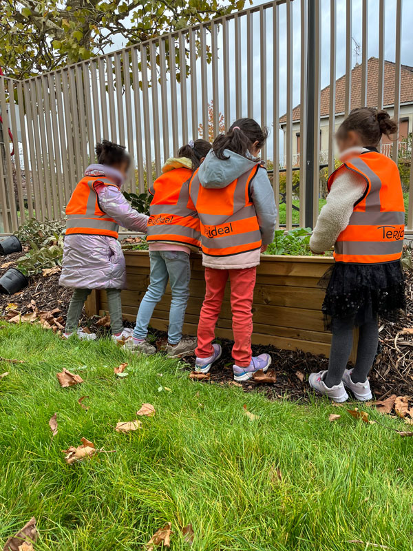 Équipés de gants et de leurs mini gilets Terideal, les élèves ont activement contribué à l’embellissement de leur cour d’école. Cet atelier a permis de les sensibiliser à la nature et de leur faire vivre une expérience concrète autour du projet de leur établissement.