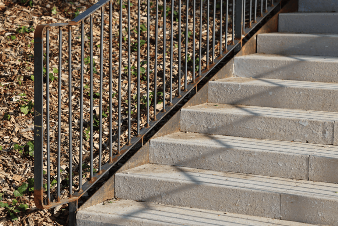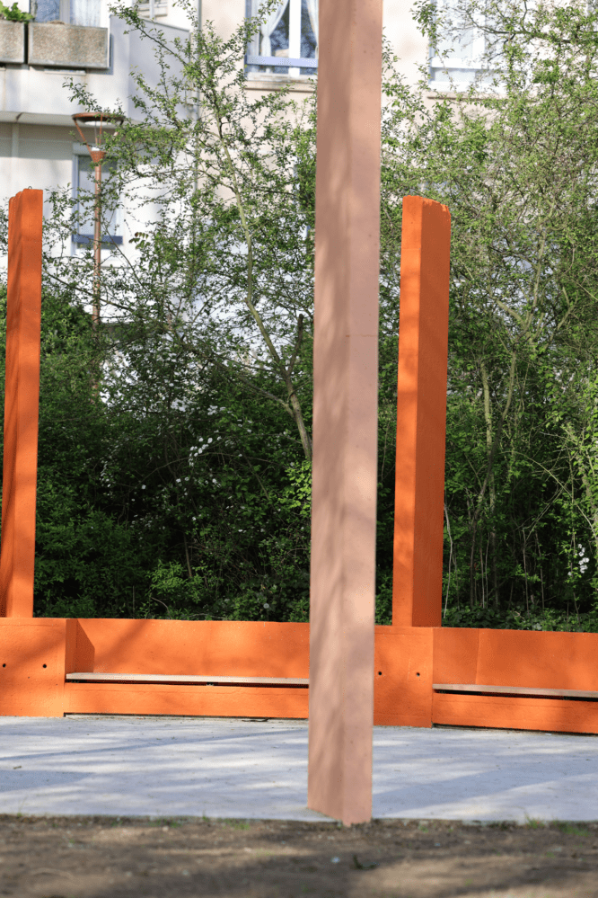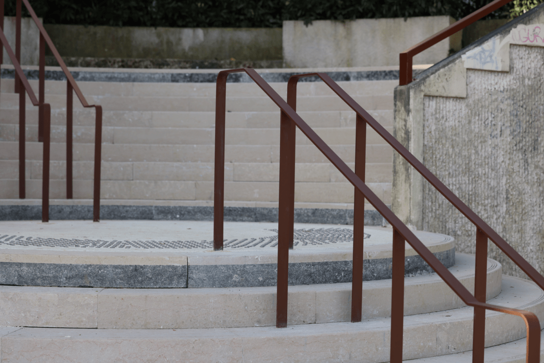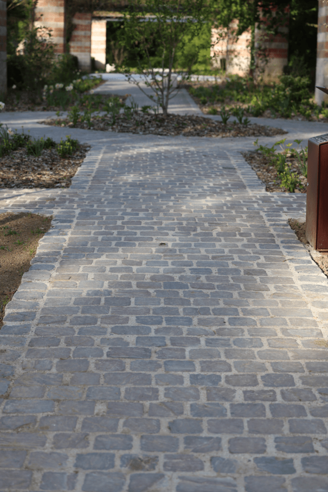 Notamment, des pavés en grès ont été utilisés pour structurer les cheminements. Des éléments de serrurerie en acier corten viennent renforcer l’identité du site.