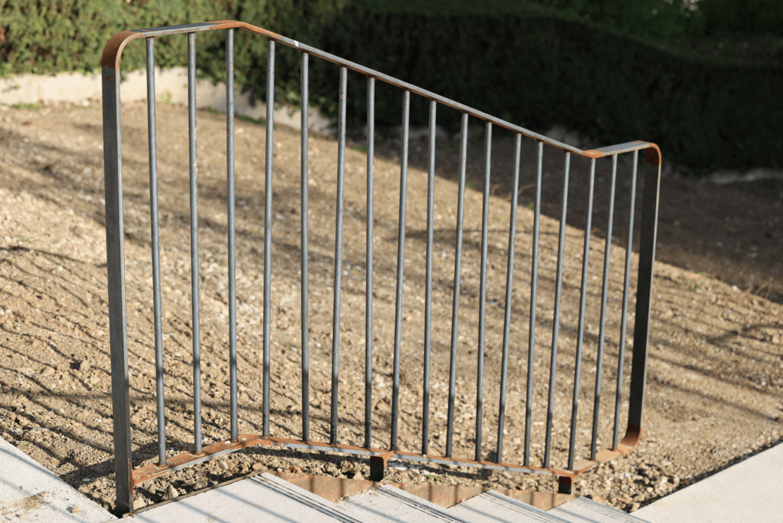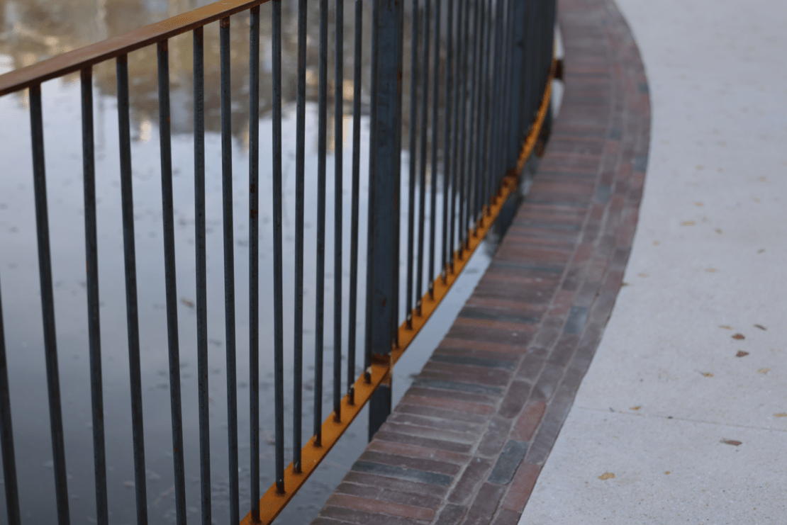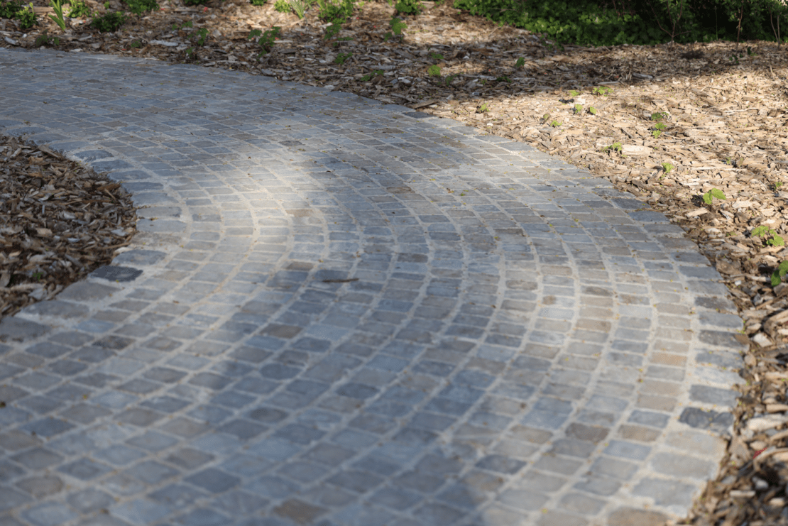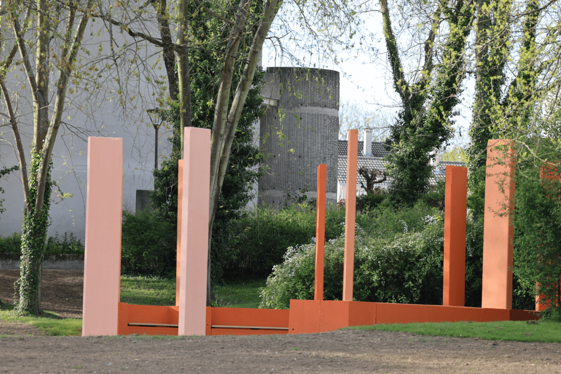 Notamment, des pavés en grès ont été utilisés pour structurer les cheminements. Des éléments de serrurerie en acier corten viennent renforcer l’identité du site.